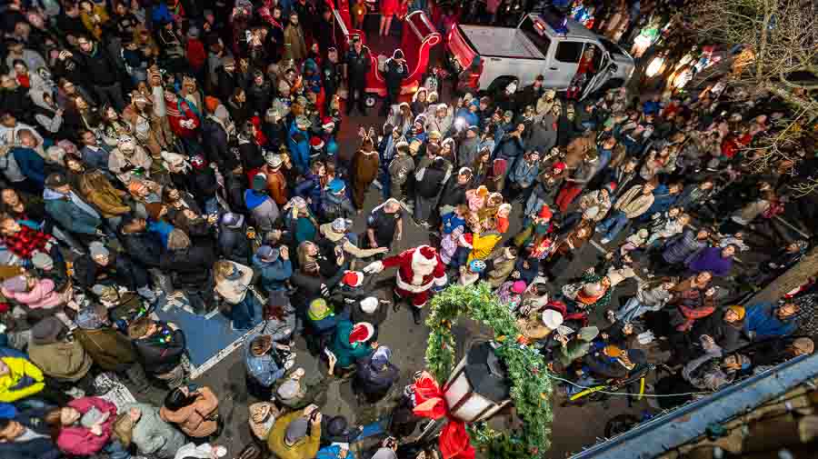 After the parade Santa made his way up to the Brickroom restaurant balcony where he addressed an enthusiastic crowd cheering him on. He started singing “Jingle Bells” as everyone standing on the streets and in the Plaza sang along.