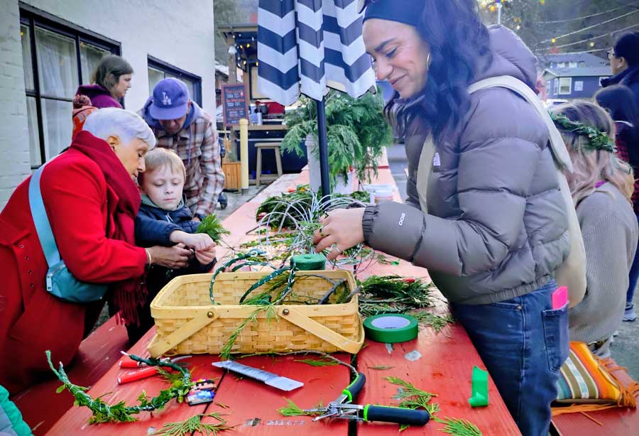 At The Drift Collective Marketplace, a woman-owned business on Main Street, they were serving hot cocoa, cider and wine outside on their outdoor patio with tables and gas fires. At a long red picnic bench, store employees set up a free head-wreath making station for attendees wanting to add a little holiday spirit to their outfit.