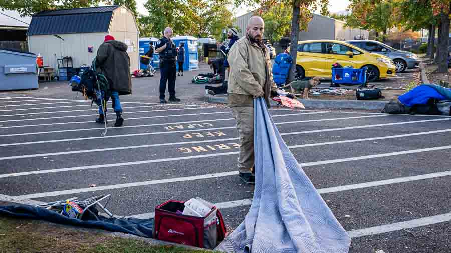 For about 30 people, including a handful with dogs, their morning ritual consists of rushing to pack up their belongings — tents, blankets, sleeping bags, water jugs, shelf-stored food and other personal items.