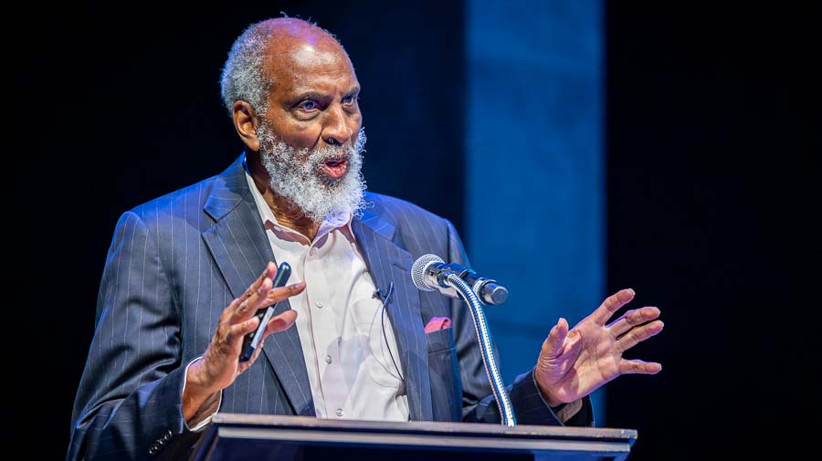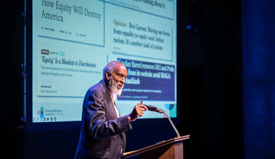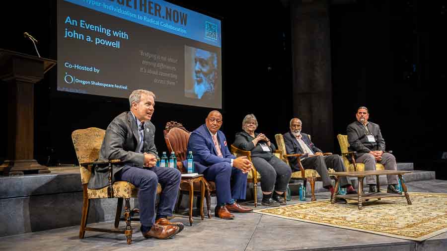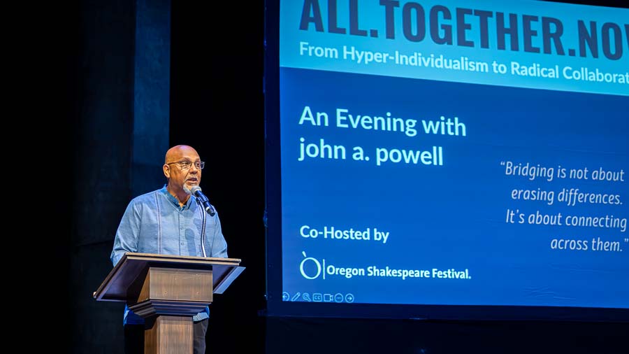 A full house of some 600 people flocked to the Oregon Shakespeare Festival campus for a presentation by University of California, Berkeley Professor of Law and African American Studies and Ethnic Studies john a. powell, director of the Othering & Belonging Institute. He spells his name in lowercase in the belief that we should be “part of the universe, not over it, as capitals signify,” according to UC Berkeley News.