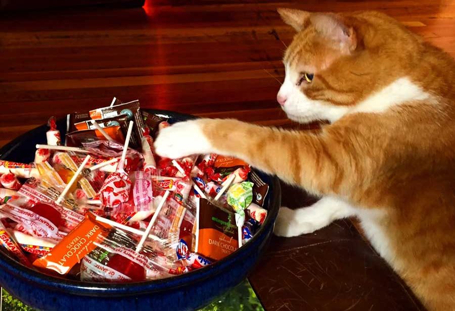 For indoor cats, it’s best to keep them closed in a quiet, safe room on Halloween night while you’re opening the door for trick-or-treaters — this will prevent them from escaping outside when the door is open. And, once the kids stop ringing the bell, you can give the cats their own appropriate treat as a reward.