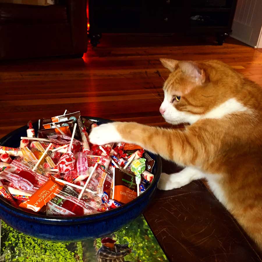 If your cats are indoors only, this is a great start; they are already safe from outdoor hazards and predators — and our local bird population is safer, too. But if you’re decorating the interior of your house, make sure there’s nothing your kitty can ingest (like those fake spiderwebs) and avoid any choking hazards (like the plastic spiders that come with those webs). Also, keep Halloween candy out of their reach — even if your cat doesn’t have a sweet tooth, the little wrappers are crinkly, and these make fun toys for cats. (If your cat does eat something they shouldn’t, call the ASPCA poison control line for help and information.)