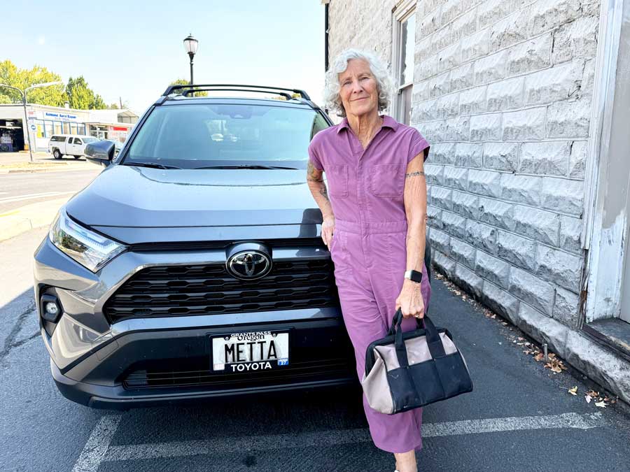 With her veterinary bag and a Title Nine jumpsuit as her uniform, Dr. Backus travels from Ashland all over the Rogue Valley. The jumpsuit is “perfect for what I’m doing,” she says. “Hair doesn’t really stick to it. I have it in five different colors now because now all I have to do is decide what color.”