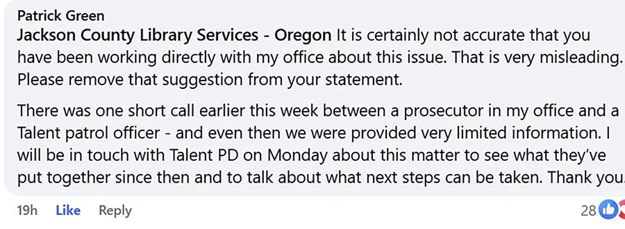 “I was also disturbed to see the initial statement from the Jackson County Library Services that included they were working directly with my office on the issue. I am not sure why that was included. Obviously, it was not accurate and I was happy that they later removed that,” the D.A. wrote.