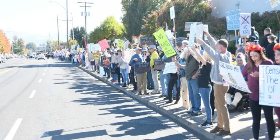 Thousands of people lined both sides of East McAndrews Road in Medford on Saturday as part of organized, nationwide protests against the Trump administration and its policies.