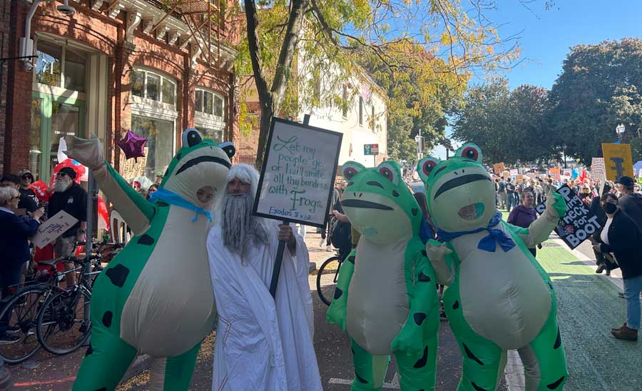 Frogs, unicorns, dinosaurs, pandas, flamingos and a hippo in a tutu twirled through the Ashland Plaza Saturday at 10:30 a.m., waving their No Kings signs. Even video game characters Mario and Yoshi made an appearance.