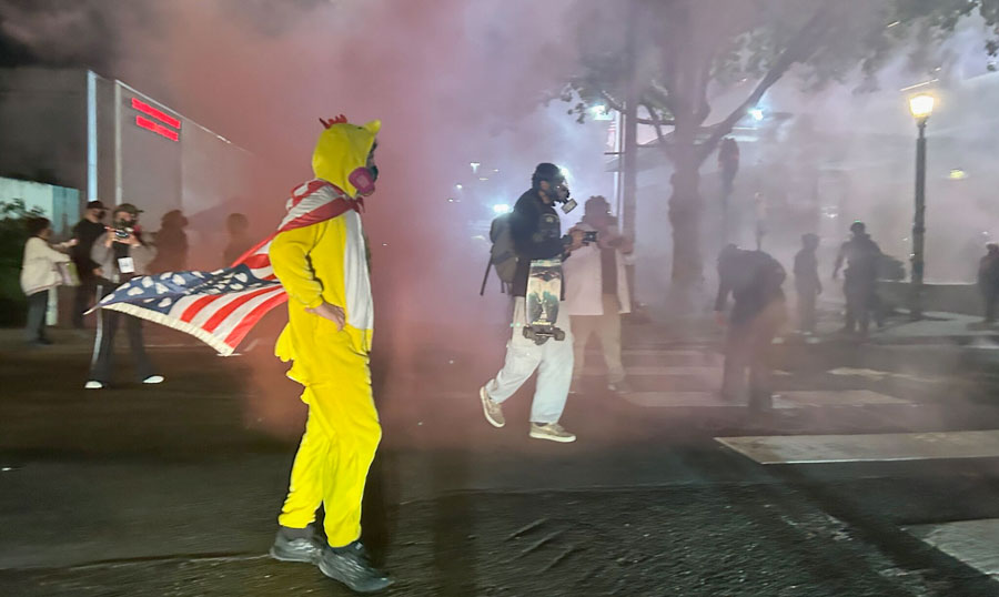 After the hearing, about 150 people had gathered peacefully around the ICE facility in Portland. Federal agents then deployed pink smoke and took two people into the facility.