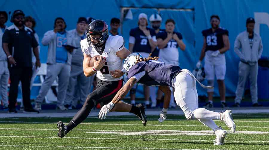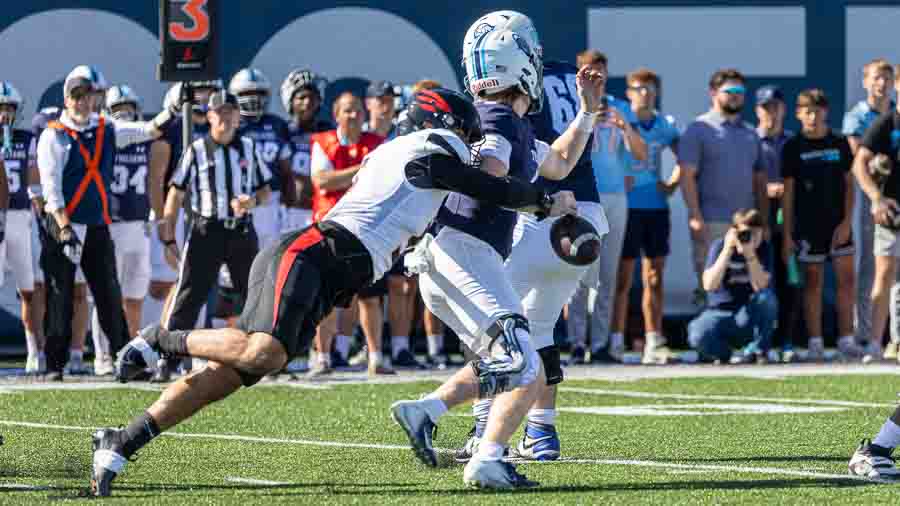 Senior defensive end Gabe Foster registered 3 ½ tackles for losses, including two sacks, for a Raider defense that limited DSU to 262 yards of total offense and negative-17 yards on the ground. Four more Raiders were credited with a sack apiece, while Jaxon Jedrykowski made eight tackles and blocked an extra point.
