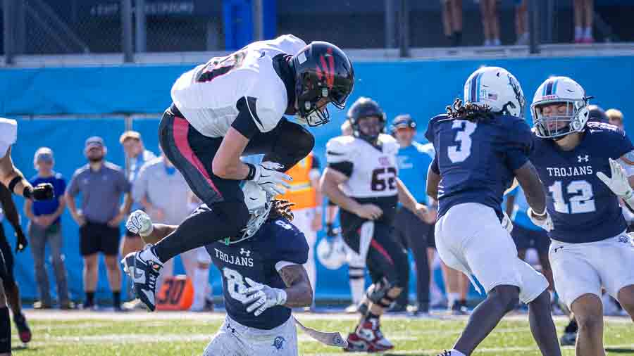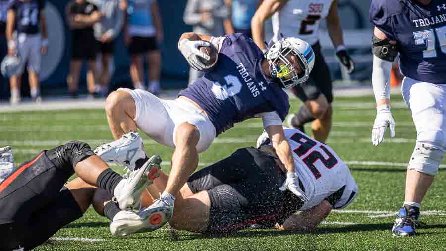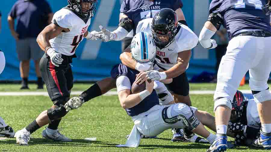 Fresh Ison accounted for SOU’s lone touchdown, plowing one yard up the middle early in the second quarter. Danny Cossette’s 26-yard field goal gave the Raiders a 10-6 halftime lead that the Trojans cut into with a safety in the third quarter.