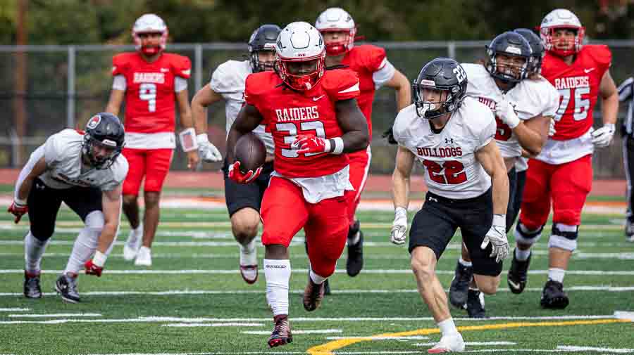 The Raiders then got the ball to start the second half, but Connor Dunlea promptly deflated them by coming up with an interception on their first play from scrimmage. The pick set up a short 23-yard march to the end zone for the Bulldogs, and after a defensive stop they went 91 yards on an 11-play drive capped by Palandri’s second TD pass to Shook, making the score 37-14.