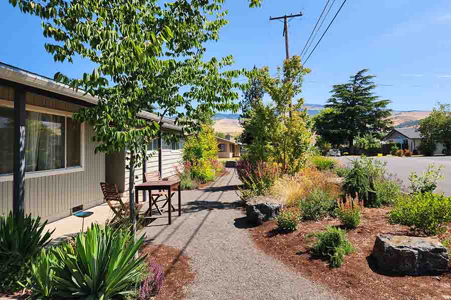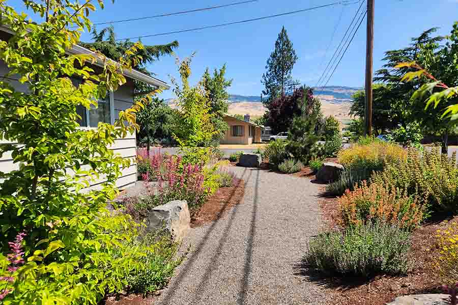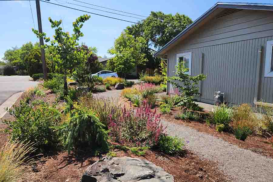 Slowly, a vision took shape and berms were created, sheltering the residence from street traffic and adding privacy for the small patio, where hot chai might be served on a cool morning. Pathways wind their way through the beds and around the corner to include the side yard, bordering Tudor Street. Large flat-topped boulders were thoughtfully sited to take advantage of their view lines. At sunset Neena enjoys a view of Mount Ashland.