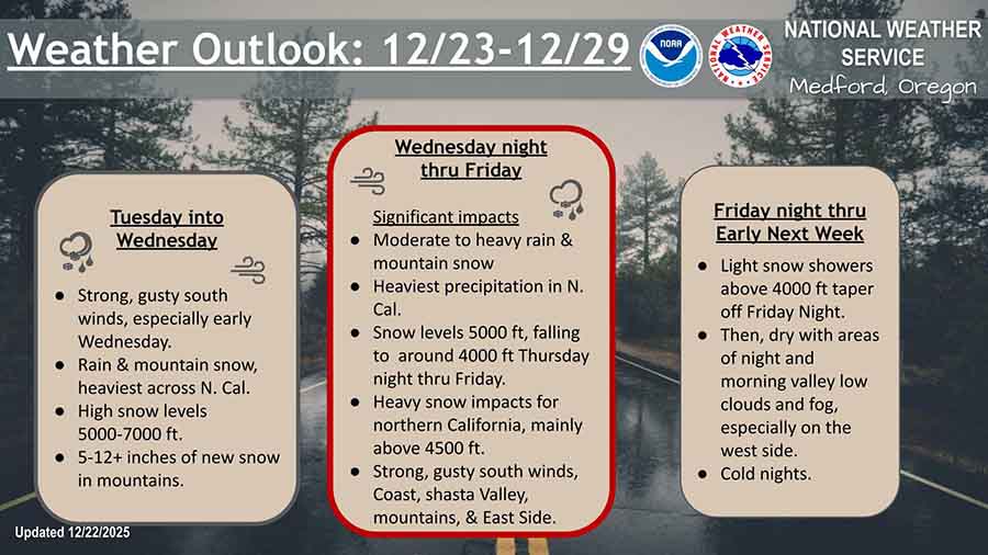 The National Weather Service is warning of high winds in and around Ashland from 10 p.m. Tuesday, Dec. 23, to 1 p.m. Wednesday, Dec. 24.