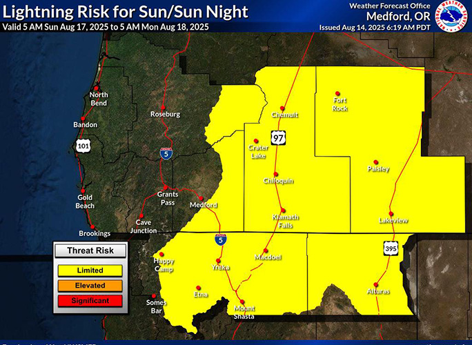 The National Weather Service in Medford noted that the unstable conditions are capable of producing gusty winds, hail, and new fire starts across an already parched landscape.