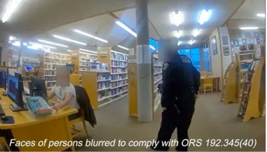 Talent police approach 33-year-old Nicholas Johnson, left, who was reported by library patrons and employees for watching videos of naked children on a library computer after being contacted by a patron Dec. 15. Body cam image from Talent Police Department