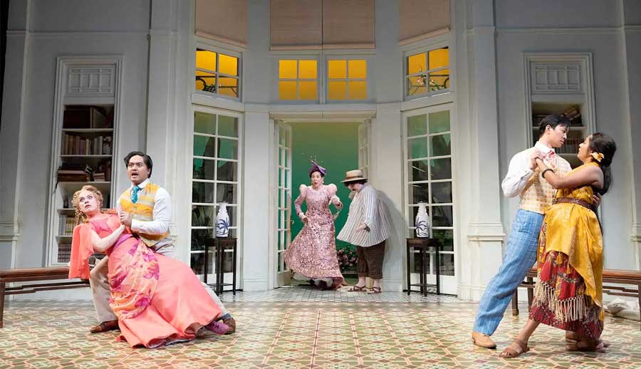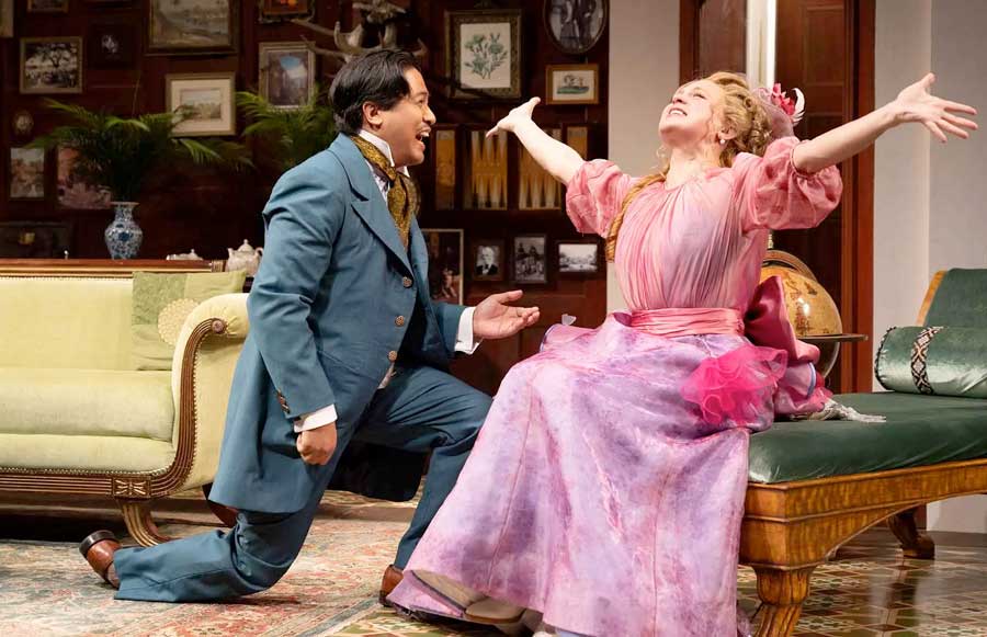 The show’s two male leads are especially strong: Newcomer Hao Feng is an arch comic dreamboat as Algernon Moncrieff, preening and posing and grabbing for all the pleasures at his fingertips; and the endlessly versatile Julian Remulla offers an endearing take on the more serious John Worthing.