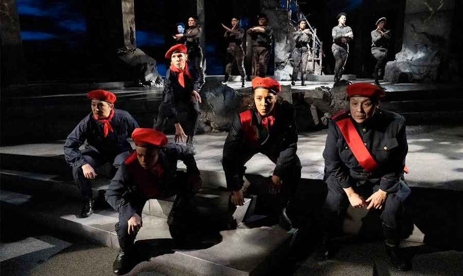 This rendering captures a sense of the people being more servants than served, their fervor being manipulated in radically opposing directions by the charisma of a few whose stated aims are freedom and justice. The movement of energy feels fraught rather than principled, no matter how compelling the rhetoric. It may well be that these women and nonbinary performers, imparting this text with such energy and skill, are especially well-equipped to pull forth energetic reality that is hardest to capture.