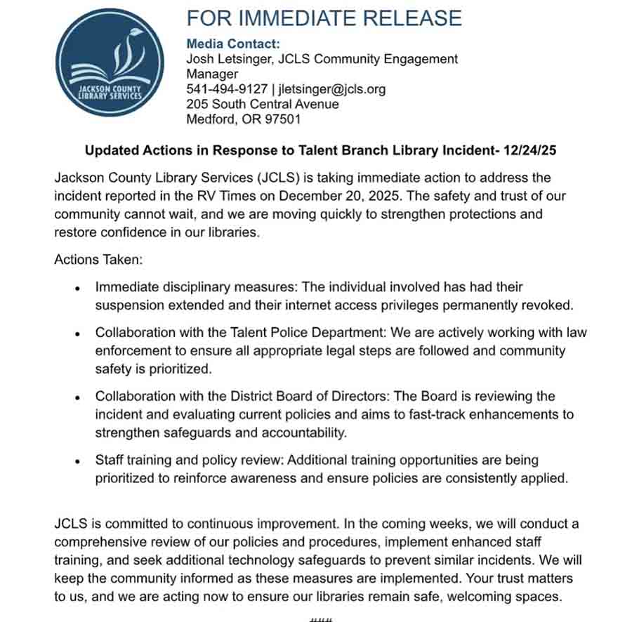 Actions being taken, according to the release, include an extended suspension and permanent revocation of the man’s internet privileges; working with Talent police to “ensure all appropriate legal steps are followed and community safety is prioritized”; and working with the library district board of directors to review the incident and evaluate current policies to “fast-track enhancements to strengthen safeguards and accountability.”