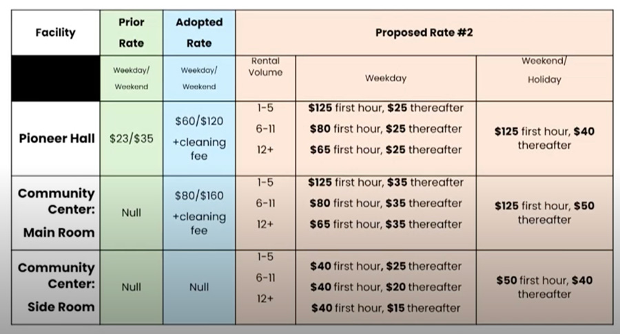 The previous fee proposal — rejected by the council — was a flat rate of $80 on weekdays and $120 on weekends at Pioneer Hall, and $80 on weekdays and $150 at the Community Center. There was also a cleaning fee.