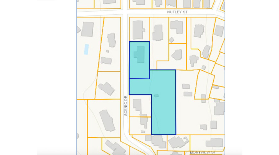 Slopes in excess of 35% just below Scenic Drive — essentially a drop-off — prevented the city from requiring standard street tree improvements along the sidewalk. Other slopes necessitated a driveway option buttressed by up to 10 feet of fill materials and a retaining wall.