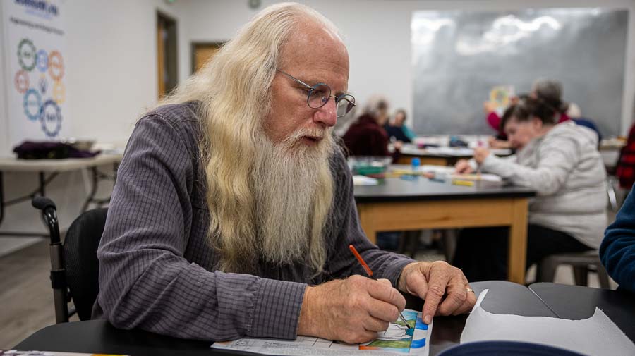 Michael Maag colors one of the depictions of endangered plants and animals in the Pacific Northwest that will become a panel in the art installation. Ashland.news photo by Bob Palermini