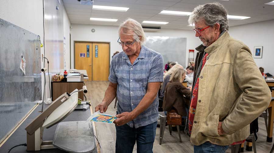 Jon Hanken, left, removes Steve Godwin’s panel from an iron he used to dry and flatten it. Ashland.news photo by Bob Palermini