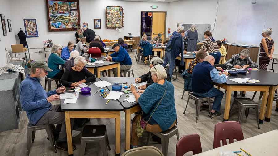 A classroom at ScienceWorks was busy Sunday afternoon with visitors coloring drawings of endangered species that will be included in an installation project led and designed by Jacksonville artist Karen Hanken. Ashland.news photo by Bob Palermini