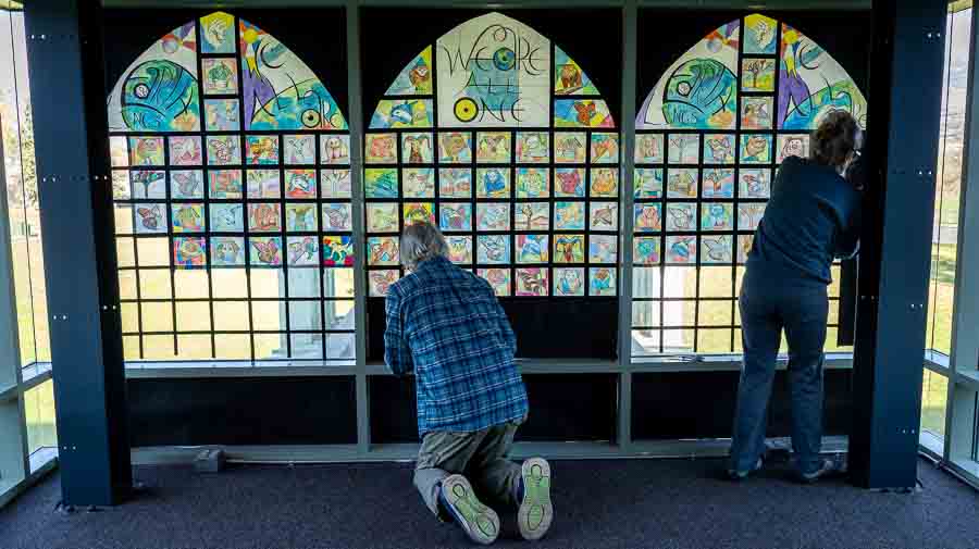 Jon Hanken, left, and artist Karen Hanken work on installing the 85 panels, colored by attendees, creating a stained glass effect in a room at ScienceWorks Hands-On Museum. Ashland.news photo by Bob Palermini
