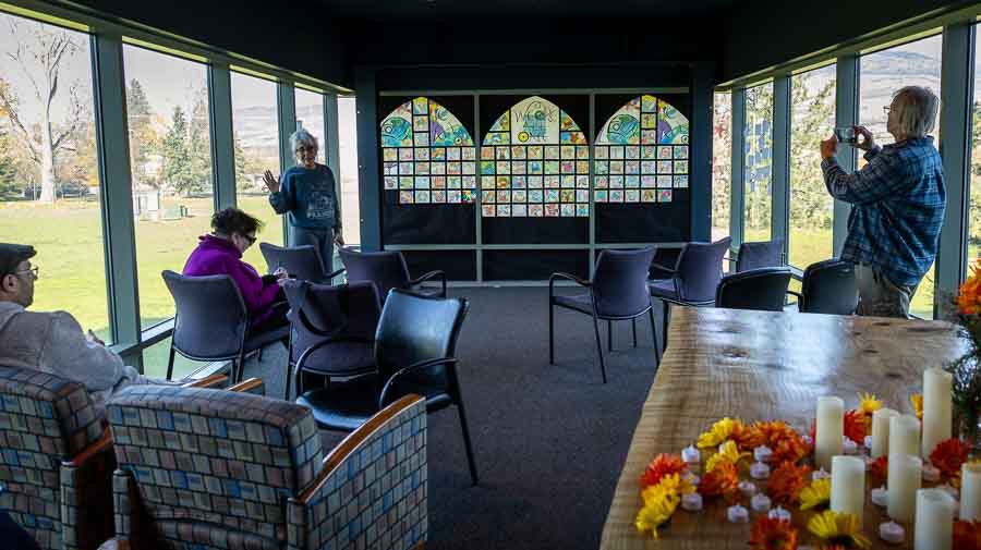 After viewing the film, attendees were invited to participate in a collaborative art project inspired by the stained-glass images in the film. Ashland.news photo by Bob Palermini
