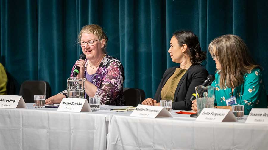 Ann Gaffney, left, Position 1 candidate, talks about her reaction to the targeted budget reductions recommended by the Ashland superintendent for the coming year. Ashland.news photo by Bob Palermini.