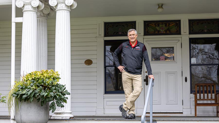 Mike Beagle, director of alumni relations for SOU, on the porch of the Plunkett Center, home to the university alumni office. Bob Palermini photo/@bobpal