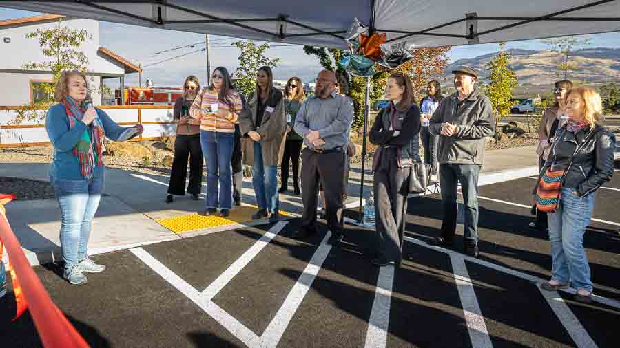 AGE+ CEO Stephanie Hooper talks about the lack of affordable housing in Oregon during the ribbon-cutting ceremony for Oro Vista Village in Talent on Thursday morning. Ashland.news photo by Bob Palermini