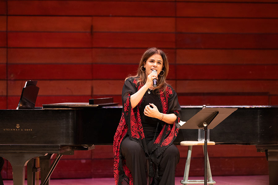 As part of its Heart of Humanity series for 2025-26, Anima Mundi Productions was finally able to present Shireen Abu-Khader, an internationally recognized, dynamic Palestinian-Jordanian-Canadian choral leader, vocalist and composer-arranger of Middle Eastern music, at Southern Oregon University’s Music Recital Hall.