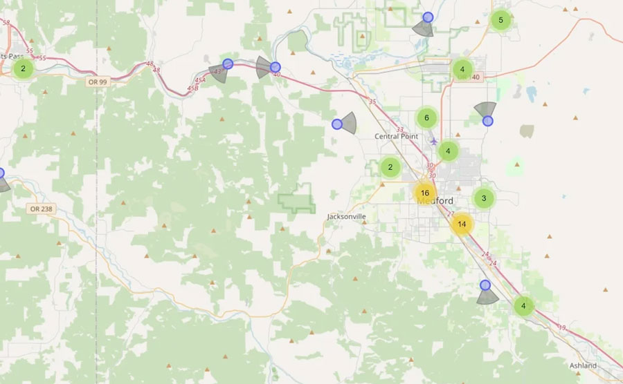 An online map hosted by an open source project dubbed DeFlock.me shows locations of Flock surveillance cameras in the Rogue Valley. The map shows Flock camera locations in cities including Medford, Central Point, Eagle Point, Gold Hill and the unincorporated community of White City, which falls under county jurisdiction.