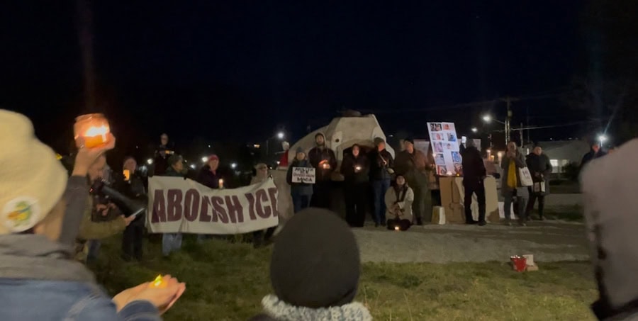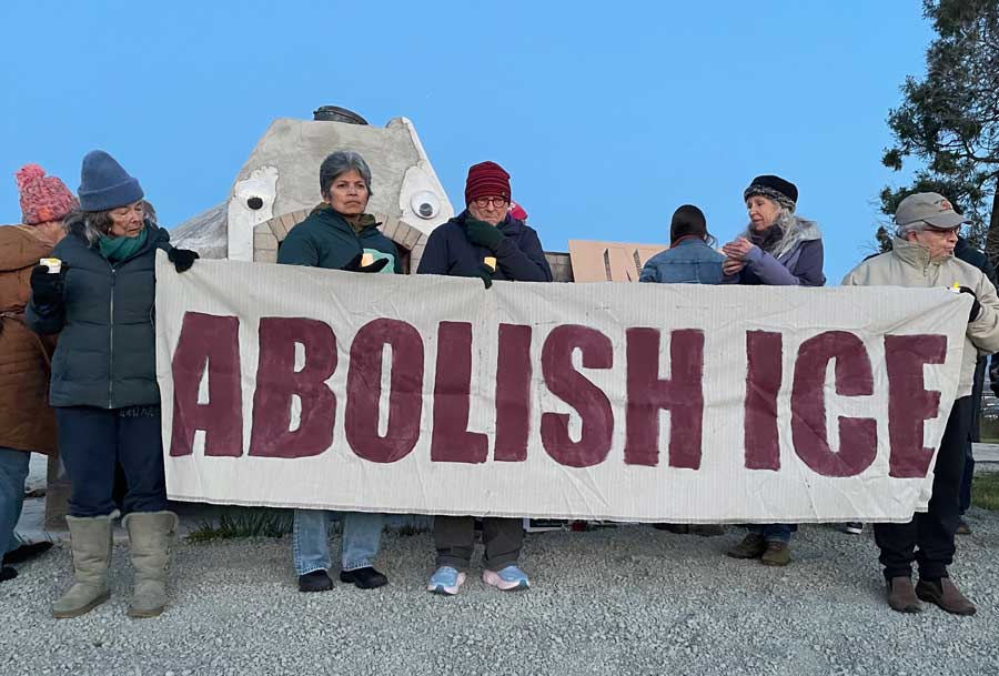 What began Saturday, Jan. 24, in the late afternoon with a dozen individuals gathering around an altar and holding a banner that read “ABOLISH ICE” grew to a circle of 80 by sunset. Many attendees stayed a full hour, even as the temperature dropped. Some visibly shivered despite their stocking caps and extra jackets.