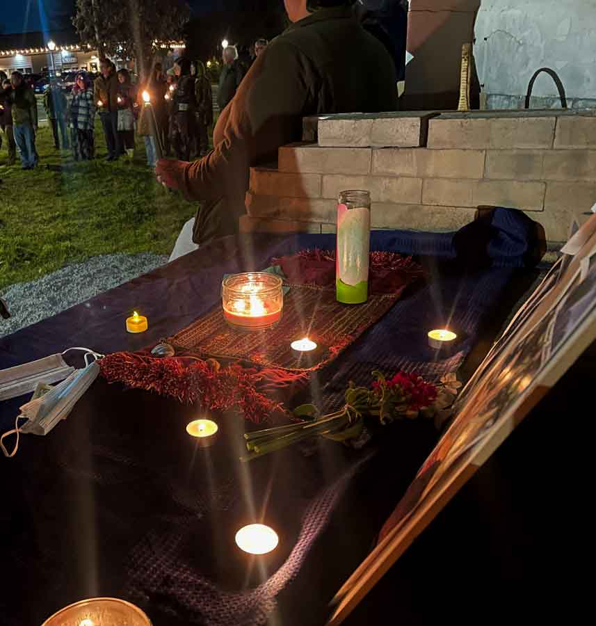 Community members began building an altar on the clay pizza oven, the only thing left on a vacant corner lot after the Almeda Fire swept through in 2020, in downtown Talent late Saturday afternoon. Photos of Alex Pretti, Renee Good, and others were set up on a cloth with candles. Meg Wade photo for Ashland.news