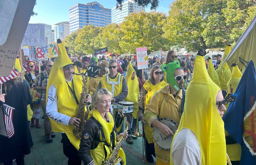 Protesters included the Unpresidented Brass Band, out in big numbers in banana suits. The band is “more resolute” since its clarinet player was arrested at the Portland Immigrations and Customs Enforcement facility Sunday, founder Miles Thompson said.