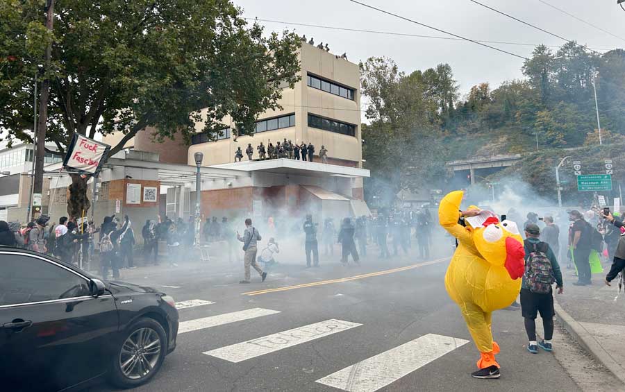 Inflatable frog costumes have become a fixture of regular protests outside Portland’s ICE detention facility as Portlanders seek to use whimsy to refute Trump’s descriptions of their city as “war ravaged.” Those suits appeared in Salem and Eugene on Saturday, too.