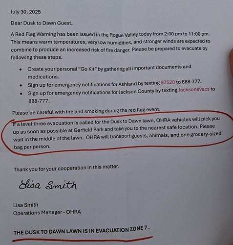 Seven days later, on a red flag warning day, OHRA Operations Manager Lisa Smith sent a letter to the guests of the night lawn outlining an emergency plan and asking individuals to be prepared to evacuate.