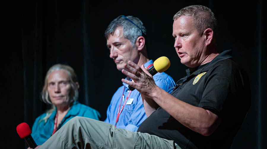 Panelists Ashland Chief of Police Tighe O’Meara, Emergency Management Coordinator Kelly Burns and Community Wildfire Protection Plan researcher Charisse Sydoriak shared their experiences and answered questions from the crowd following a presentation on wildfire preparedness, with Oregon Shakespeare Festival’s Tara Houston, also an Ashland.news volunteer, emceeing the event.