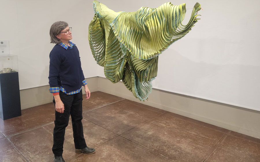 Kristy Kún is the second artist featured in the show. She creates large, colored and abstract-shaped felt sculpture that is designed to hang on cables. The work in unique and in high demand.